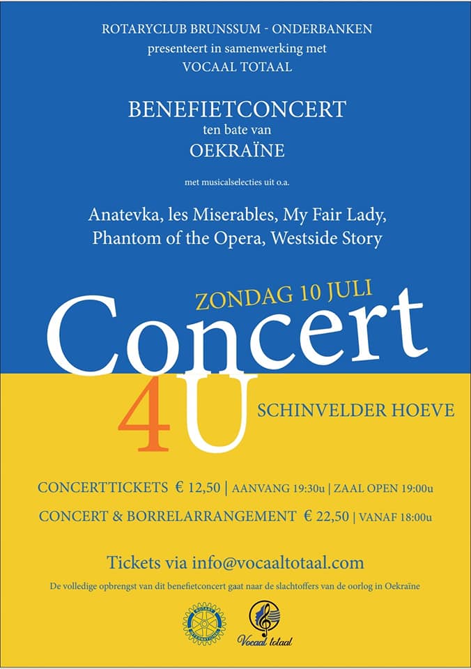Benefietconcert ten bate van Oekraïne door koor en solisten van Vocaal totaal. Met nummers en scènes uit muisicals als Les Miserable, West Side Story en Anatevka. Uitvoeringen om 18 uur en 20 uur.